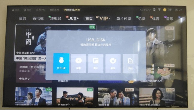 2、将下载好的小飞电视安装包的U盘插入到电视的USB接口上,会提示检测到新的USB设备打开。
