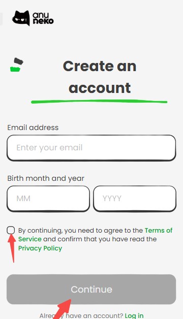 2、在注册界面填写您的电子邮箱地址和出生日期,并勾选同意相关条款的复选框,然后点击页面底部的“Continue”按钮,继续下一步操作。